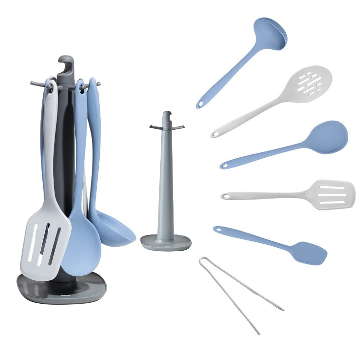 1. El sistema profesional del utensilio de la cocina del silicón incluye 7 utensilios de cocinar necesarios: cuchara ranurada L, cuchara L, Turner L, espátula L, pinzas L, Multi-cuchara XL y soporte giratorio. Utilice la única solución para mantener su cocina control.